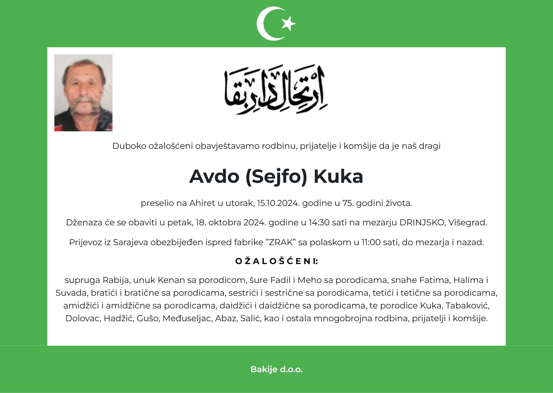 Dženaza će se obaviti u petak, 18. oktobra 2024. godine u 14:30 sati na mezarju DRINJSKO, Višegrad.