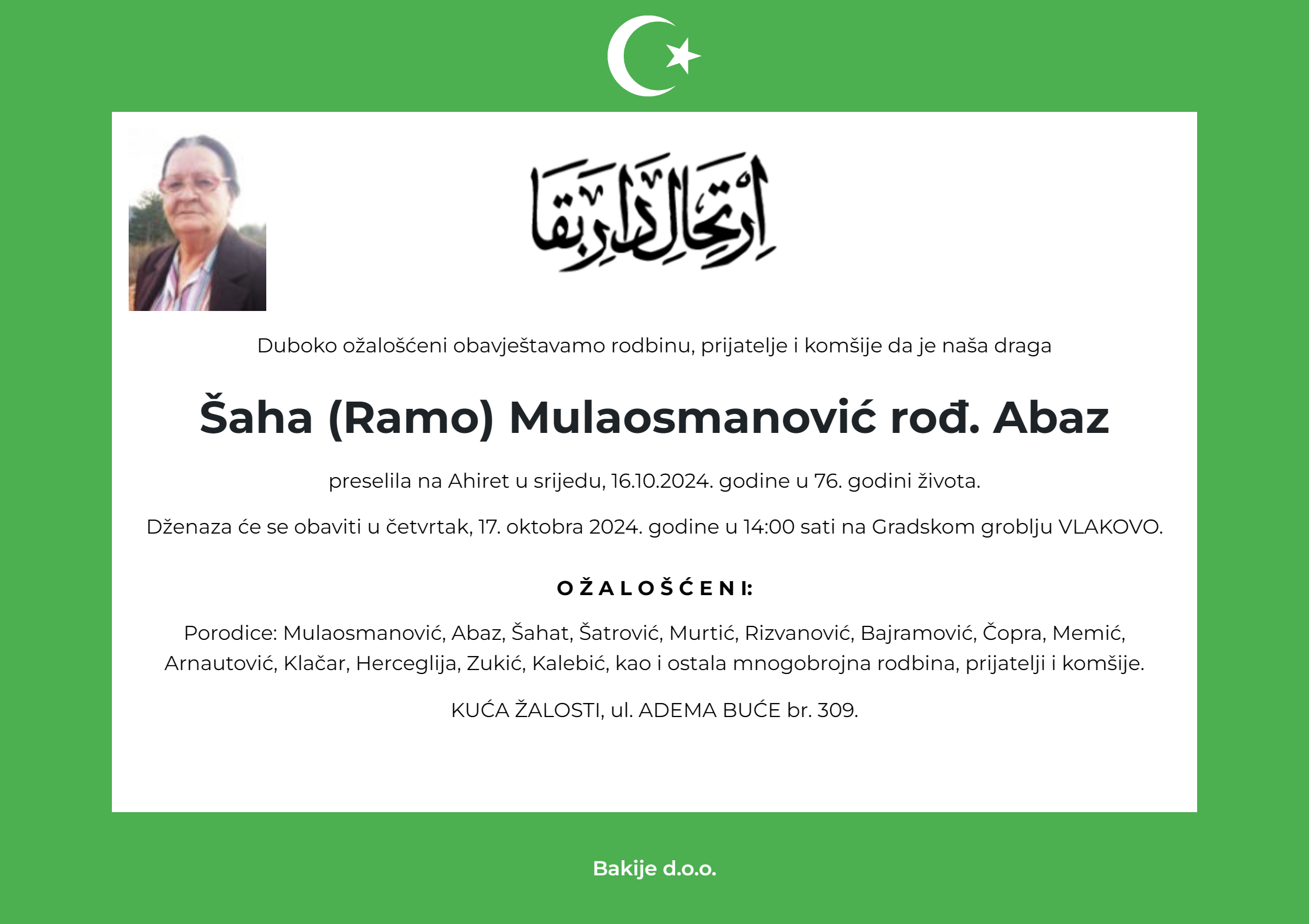 Dženaza će se obaviti u četvrtak, 17. oktobra 2024. godine u 14:00 sati na Gradskom groblju VLAKOVO.