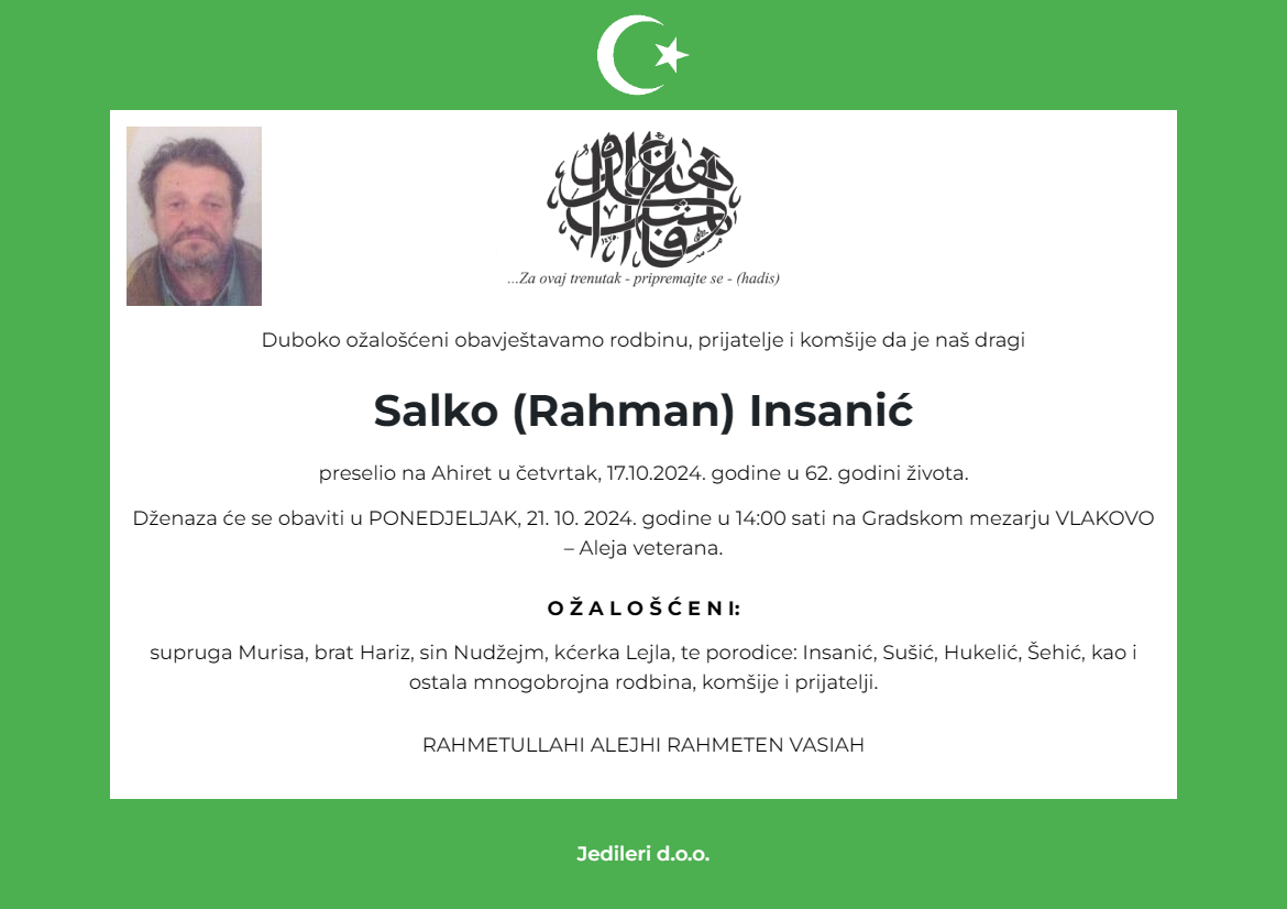 Dženaza će se obaviti u PONEDJELJAK, 21. 10. 2024. godine u 14:00 sati na Gradskom mezarju VLAKOVO – Aleja veterana.