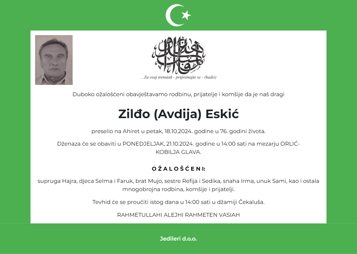 Dženaza će se obaviti u PONEDJELJAK, 21.10.2024. godine u 14:00 sati na mezarju ORLIĆ-KOBILJA GLAVA.