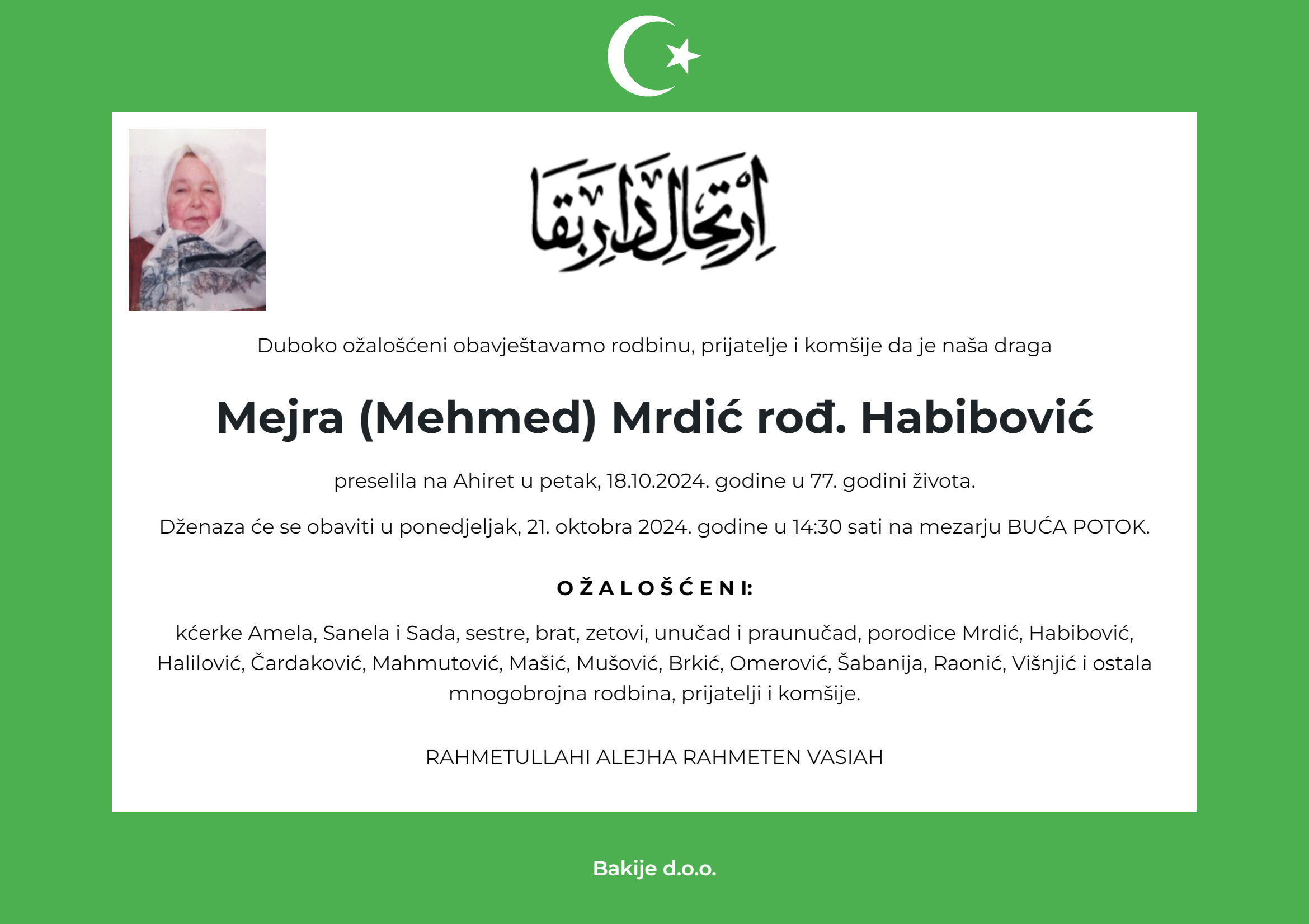preselila na Ahiret u petak, 18.10.2024. godine u 77. godini života.